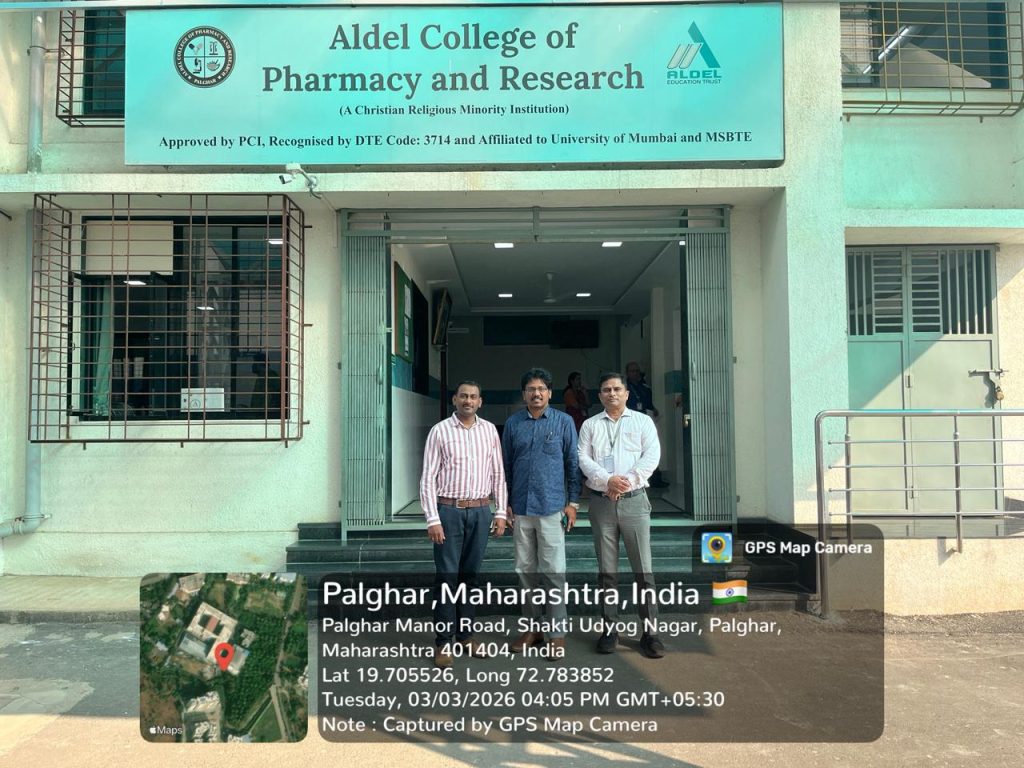 Aldel College of Pharmacy and Research, Palghar, warmly welcomed the Inspection Committee of the Pharmacy Council of India (PCI) to the St. John Campus on Tuesday, 03rd March 2026. The esteemed committee members, Dr. Ch. Praveen Kumar, M.Pharm., Ph.D., Vice-Principal, Sasikanth Reddy College of Pharmacy, Nellore, Andhra Pradesh, and Dr. Kollapudi Sai Rajesh, Sun Institute of Pharmaceutical Education & Research, Nellore, Andhra Pradesh, visited the institution as part of the PCI inspection process. The visit marked an important step in ensuring academic excellence, regulatory compliance, and the continued advancement of quality pharmaceutical education at the institute.