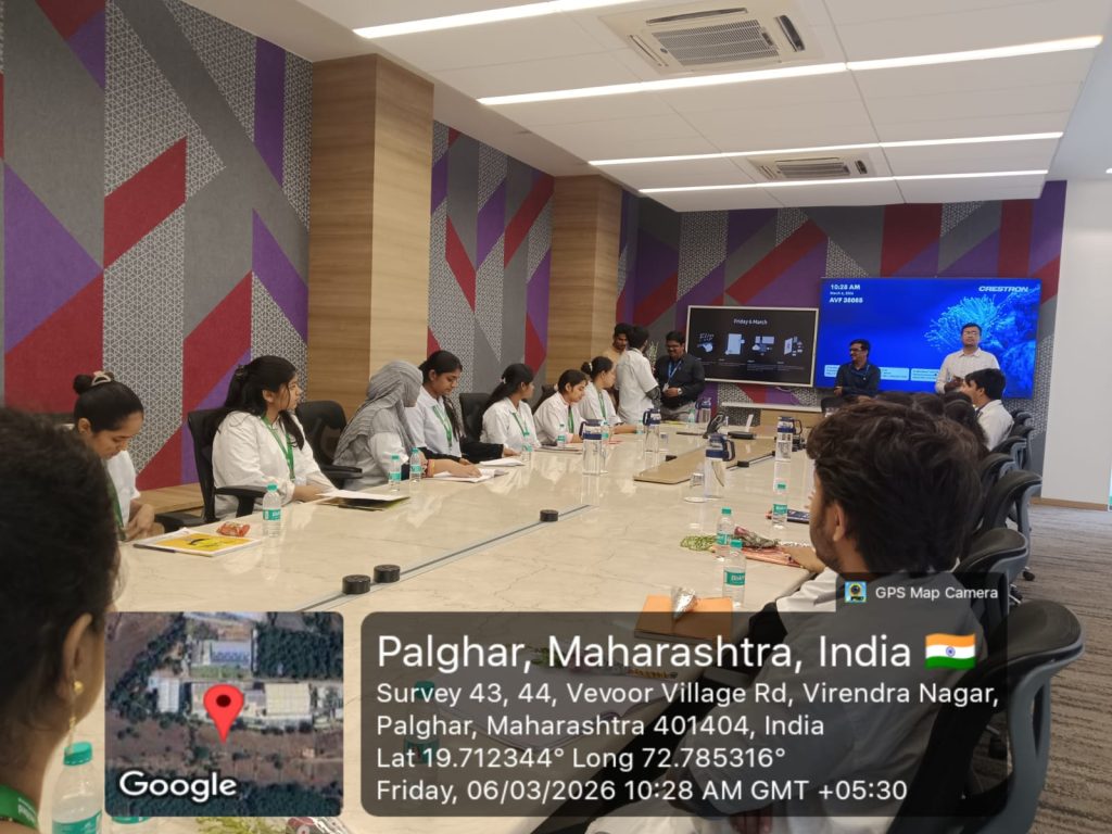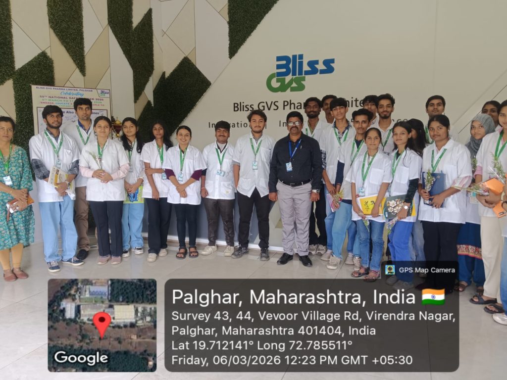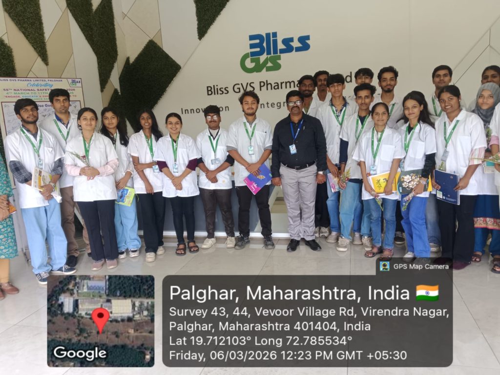 The students of S.Y.B.Pharm (Semester IV) visited Bliss GVS Pharma Ltd as a part of their academic curriculum to gain practical exposure to the pharmaceutical industry. The visit aimed to help students understand real-time pharmaceutical manufacturing processes, quality control procedures, and industrial working environments.